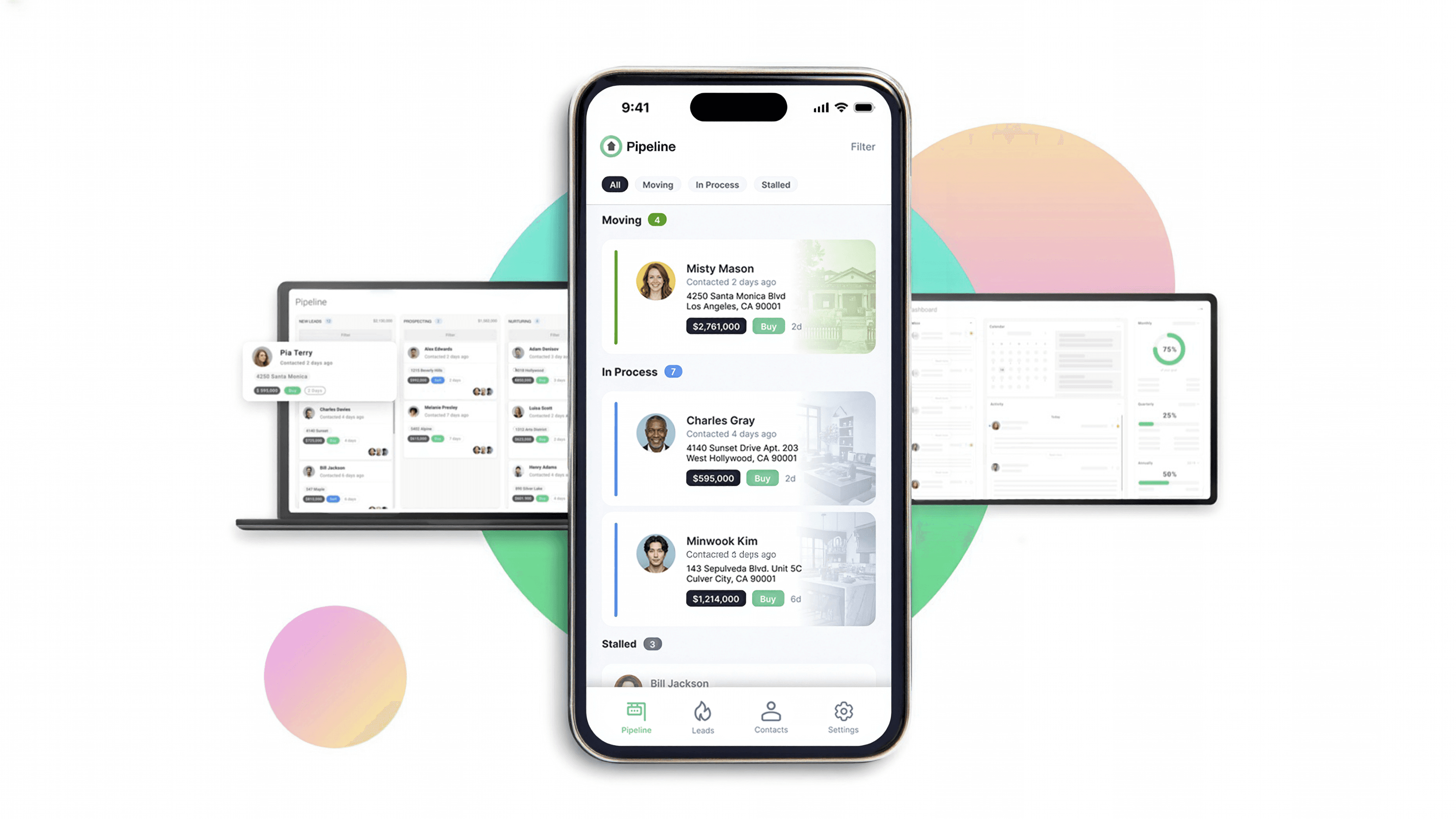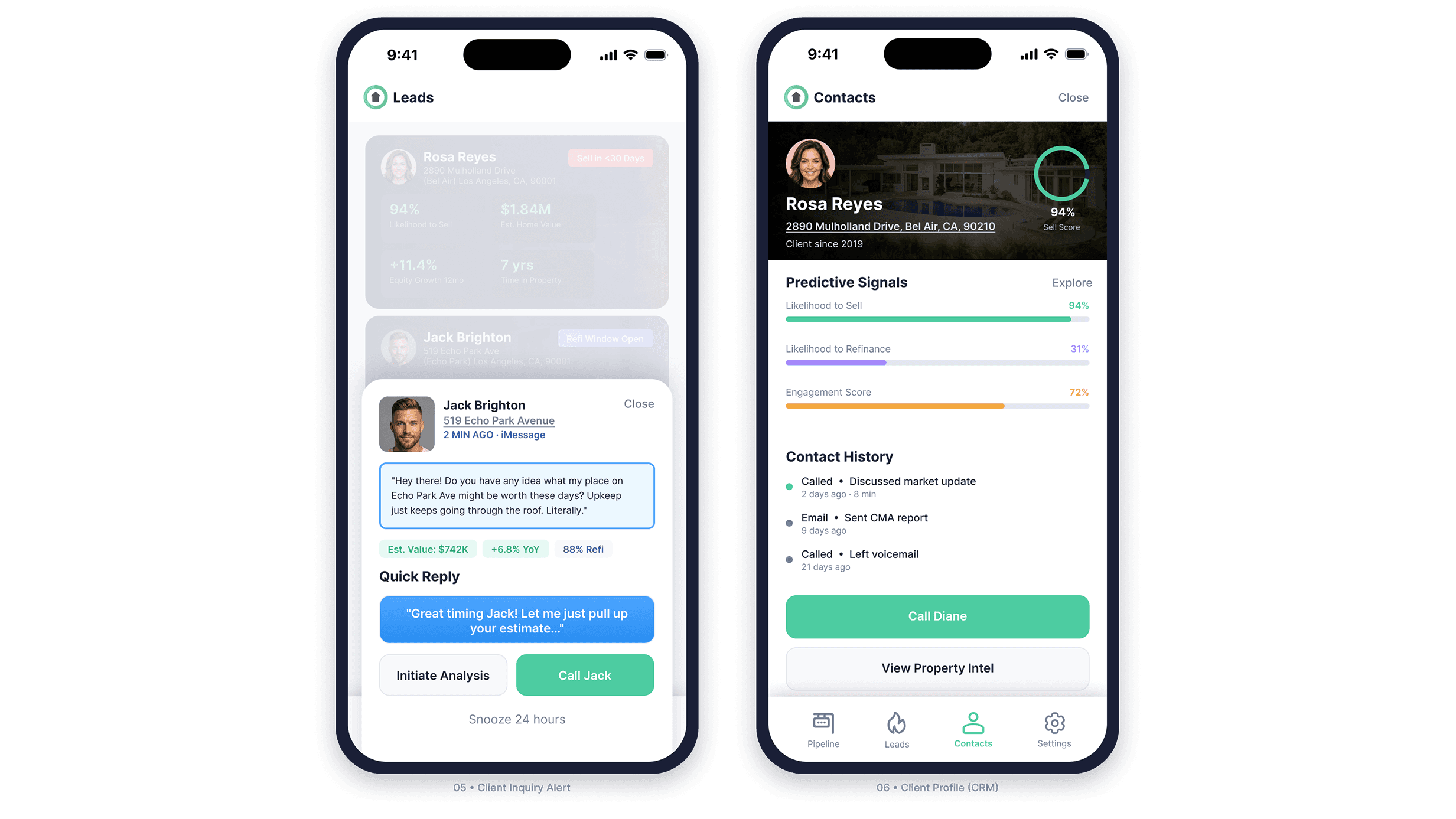 The Leads view is the product's primary intelligence layer. Every contact surfaces with a signal badge categorizing the opportunity type and a 2x2 metric grid carrying the numbers the agent needs to start a conversation. The contact's property appears as a card background. Real estate is emotional. Keeping the home visible keeps the agent anchored to what the conversation is actually about.