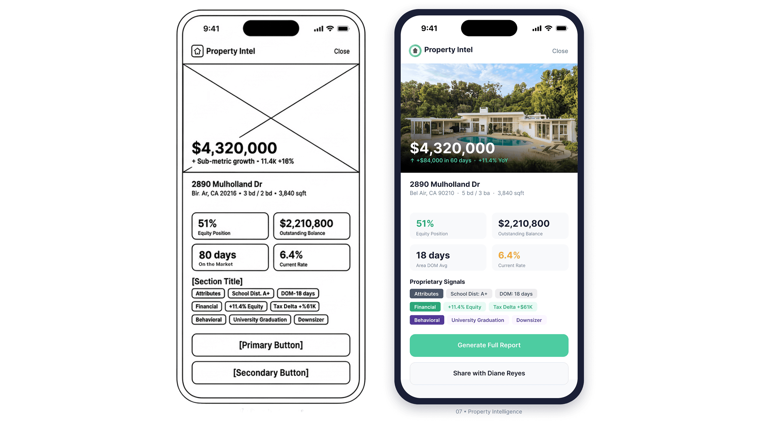 Real estate agents are not analysts. They're in the car, between showings, making decisions in seconds. The design challenge wasn't organizing data. It was translating a complex proprietary system into something a busy agent could act on without thinking hard about it.