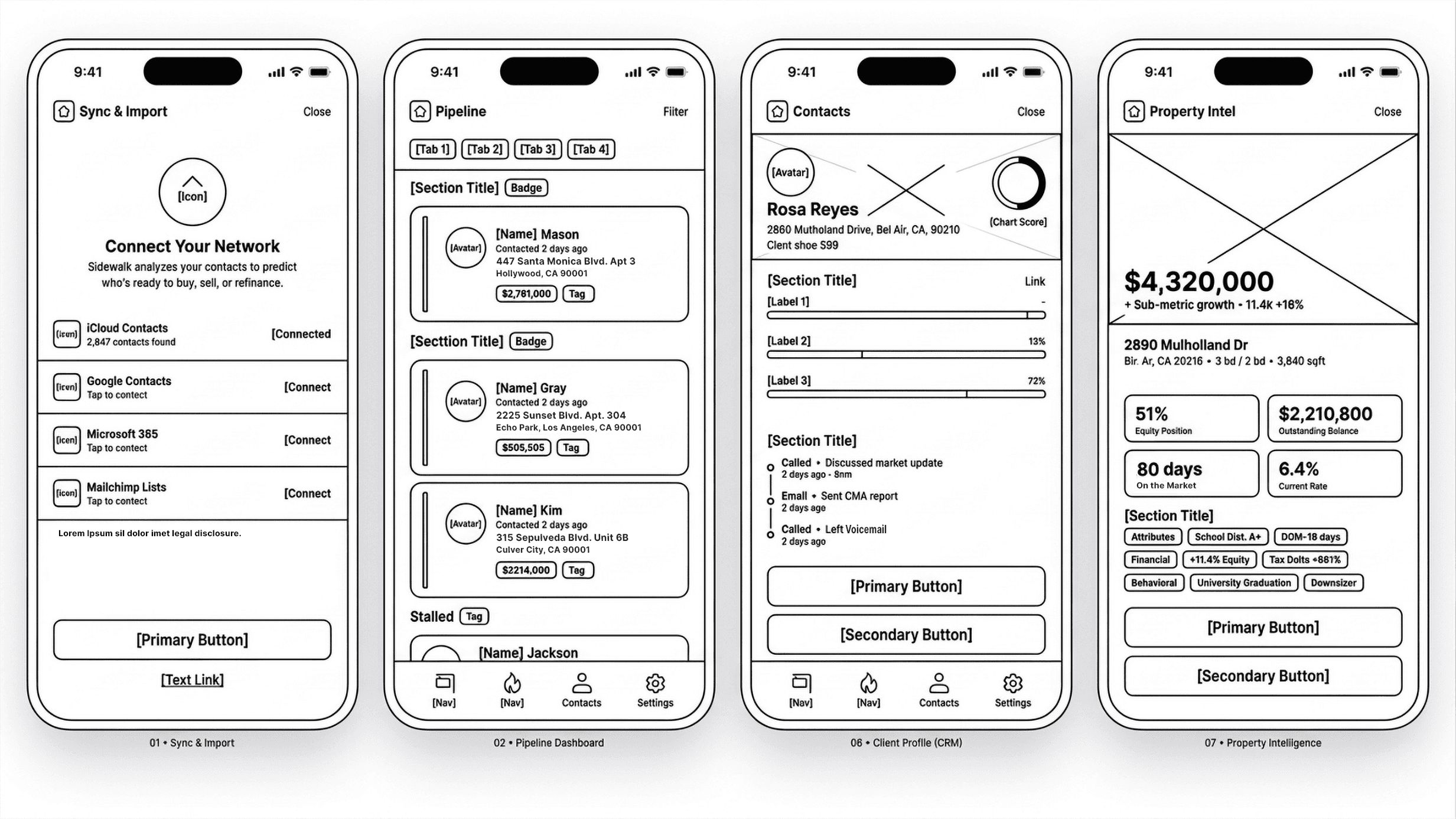 The platform analyzed an agent's existing network and surfaced the contacts most likely to buy, sell, or refinance, using proprietary predictive modeling that reverse-engineered the behavioral and financial signals behind real estate decisions. My job was to make that intelligence legible, actionable, and fast.