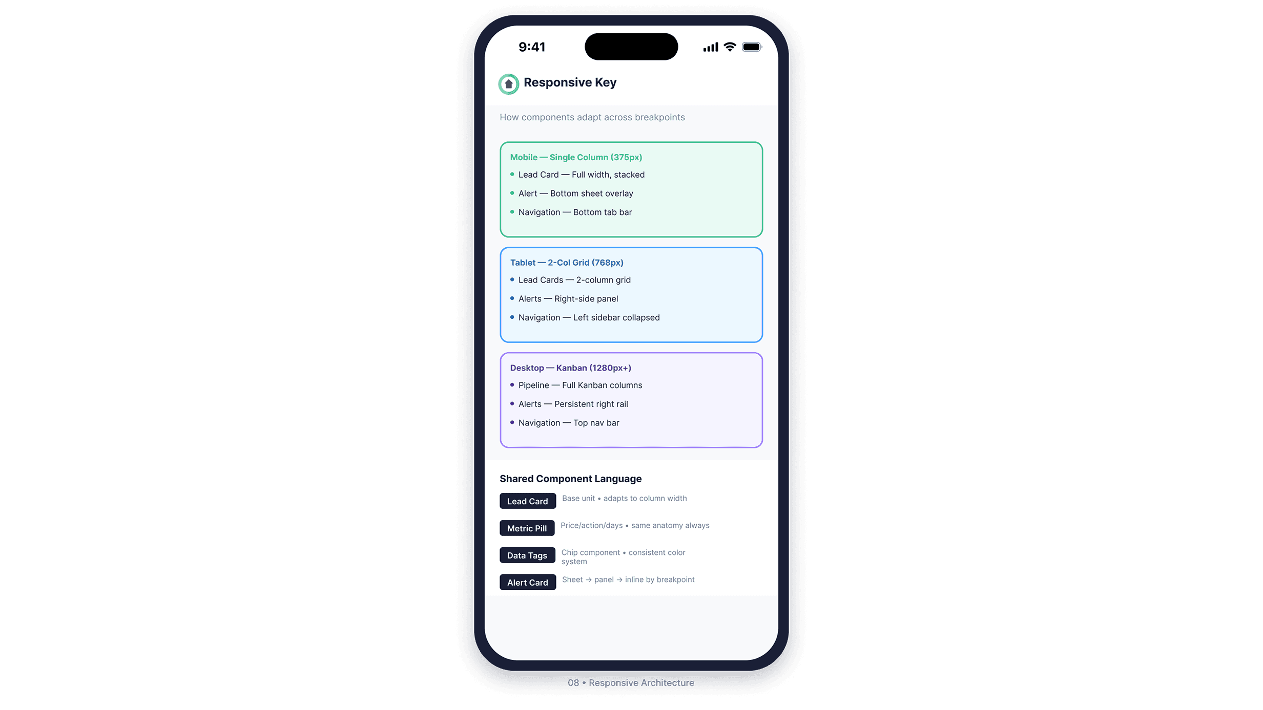 I identified four component types that would need to travel across every breakpoint: the Lead Card, the Metric Pill, Data Tags, and the Alert Card. Getting those right meant the rest of the system had something to build on.