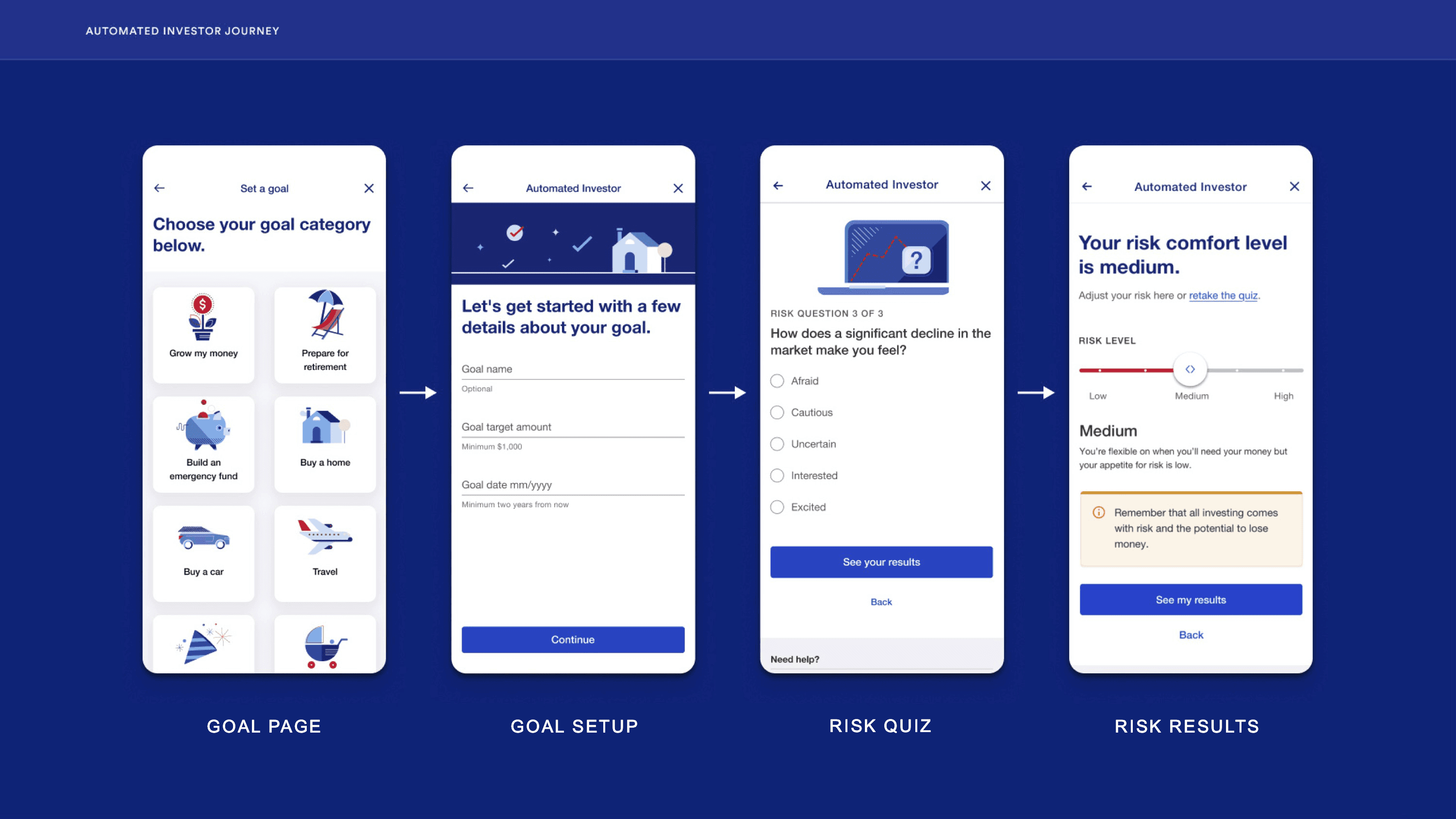 The screens below show the first half of the journey, from goal selection through risk assessment. Each step is designed to feel like a decision the user is making for themselves, not a form they're filling out for a bank.